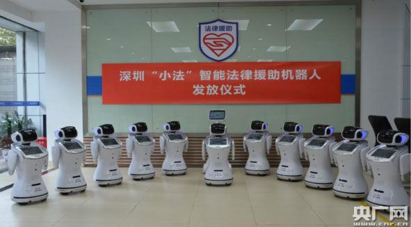 深圳市司法局11月23日下午在法律援助处服务大厅举行“小法”智能法援机器人发放仪式,将10台造型萌萌哒的智能法援机器人分发到深圳十个区“服役”。深圳市司法局党委书记、局长蒋溪林出席仪式并为这支“机器人部队”送行,寄望她们为深圳人民美好生活提供更有效的保障、更优质的服务。